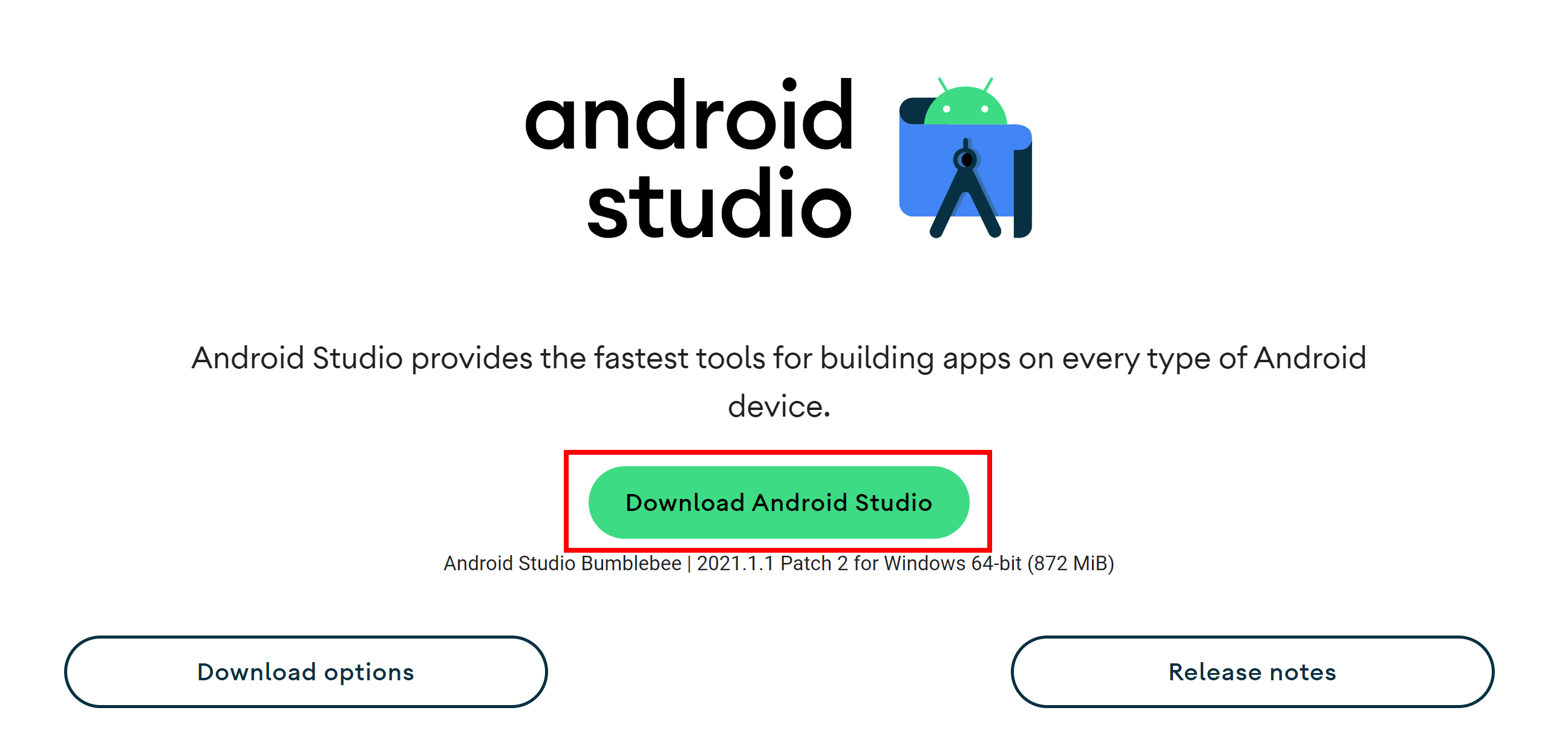 구글에서 Android Studio를 검색해서 홈페이지에 들어오시면 위와 같은 화면을 보실 수 있으실 겁니다. Download Android Studio를 클릭해주시면 됩니다. 그러면 .exe 인 설치 파일이 다운로드될 것입니다. 다운로드 완료 후 실행시켜주시면 됩니다.