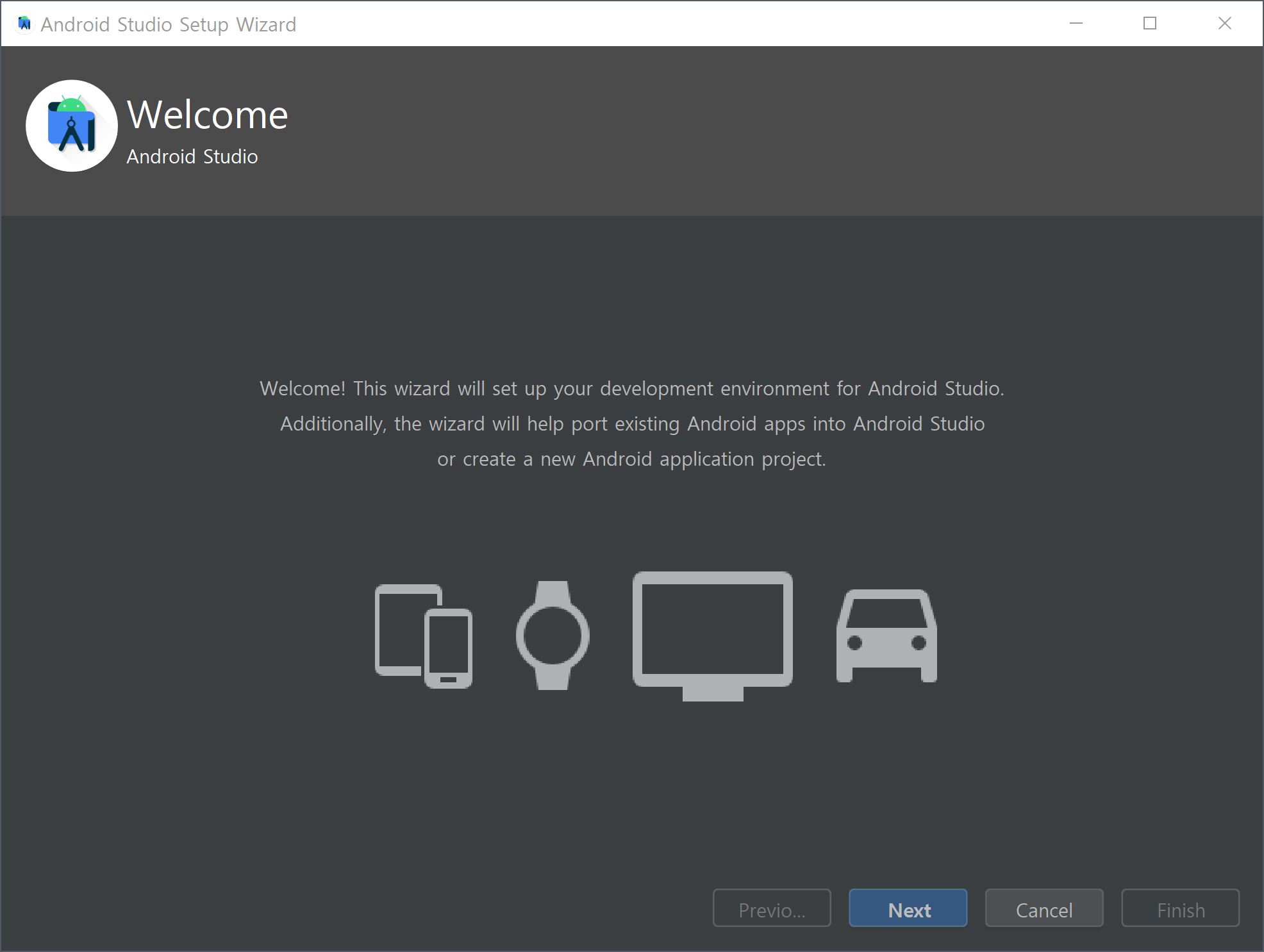 설치가 모두 완료되면 위와 같이 Android Studio가 실행 될 것입니다.