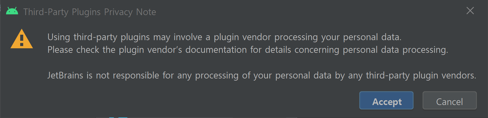 그러면 위와 같은 안내가 순서대로 나올겁니다. Accept아 Install을 눌러주시면 됩니다. 첫 번째것은 플러그인 설치에 따른 개인보안에 대한 안내이고 두 번째는 Flutter를 설치하려면 Flutter 기반 언어인 Dart를 함께 설치한다는 안내입니다. 여기까지 하셨다면 이제 마지막입니다.