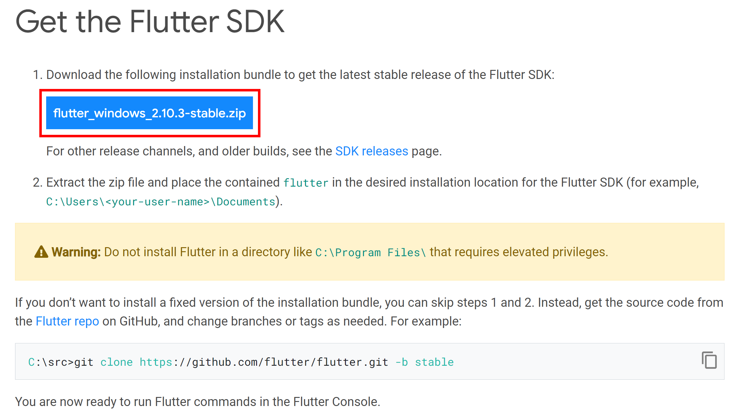 운영체제에 맞는 버튼을 누르시고 위에 표시한 파란색 버튼을 누르시면 압축 파일이 다운로드될 것입니다. 다운로드 완료 후 원하시는 폴더에 압출을 해제하시면 됩니다. 그러면 Flutter SDK 설치가 완료됩니다. 다음 시간에는 Flutter 프로젝트를 새롭게 만들고 기초과정에 대해서 배워보겠습니다.