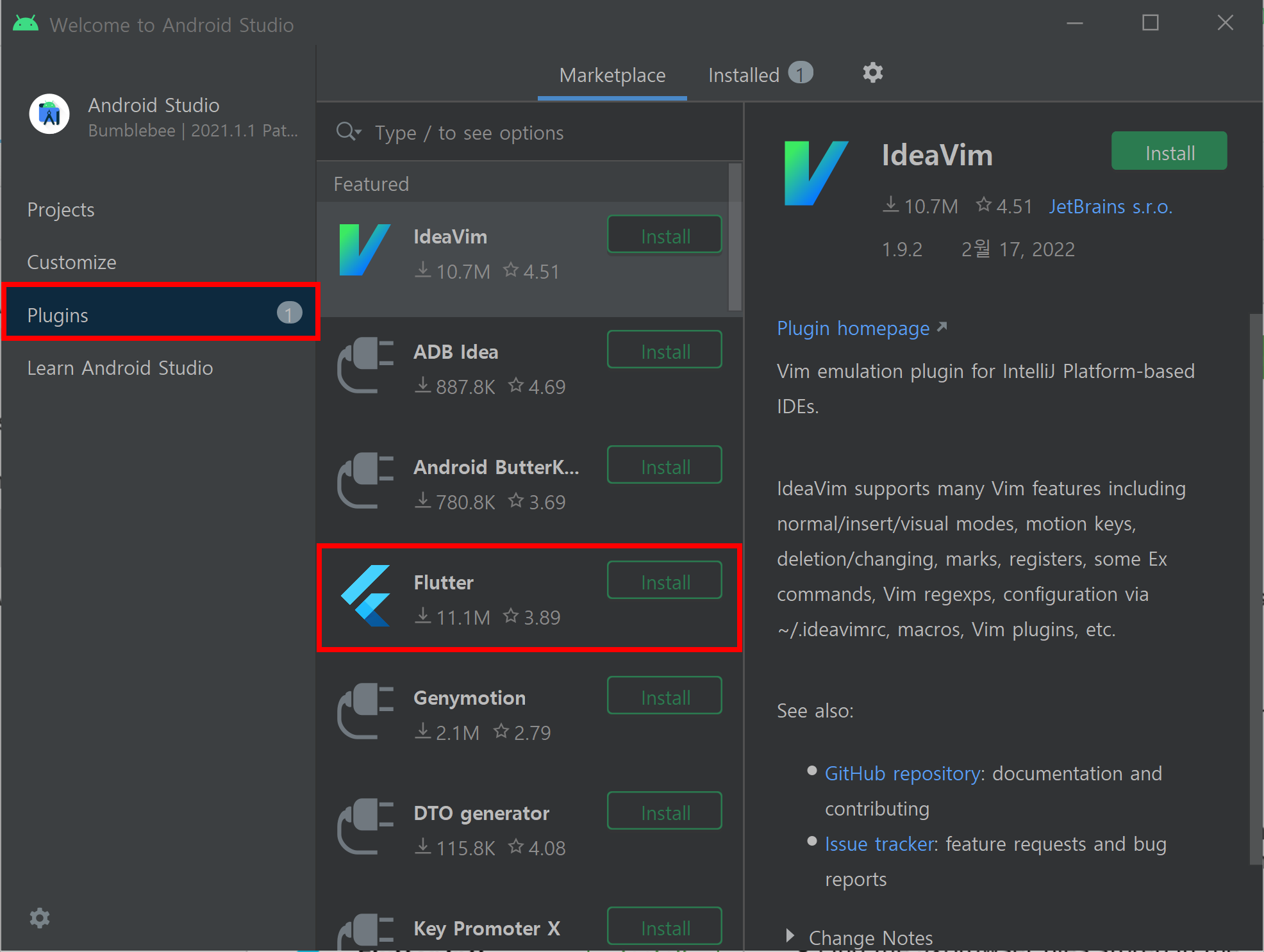 Android Studio 시작화면에서 Plugins를 눌러주시면 바로 Flutter가 보이실 겁니다. Install를 눌러서 설치를 시작하시면 됩니다.